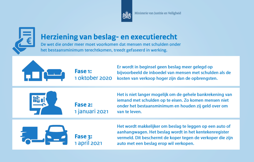 De wet die onder meer moet voorkomen dat mensen met schulden onder het bestaansminimum terechtkomen, treedt gefaseerd in werking. Als er beslag op iemand zijn spullen wordt gelegd voor de verkoop dan moet er wel iets overblijven om van te leven. Om de wet zo snel mogelijk in werking te kunnen laten treden, was overleg nodig met onder andere banken, gemeenten en deurwaarders omdat zij tijd nodig hebben hun bedrijfsvoering aan te passen. Er is besloten de wet in drie stappen in te voeren, te beginnen op 1 oktober 2020.