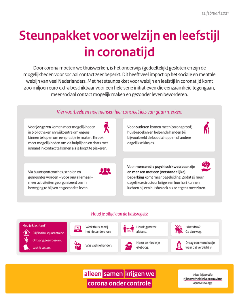 Het kabinet stelt 200 miljoen euro extra beschikbaar voor een maatschappelijk steunpakket gericht op sociaal en mentaal welzijn en leefstijl. Dit is nodig omdat het coronavirus en coronamaatregelen niet alleen een grote weerslag hebben op de zorg en de economie, maar ook op het mentaal welzijn en de fysieke gezondheid van Nederlanders. Het pakket richt zich specifiek op jongeren en kwetsbare groepen zoals mensen met een beperking of psychische problematiek en eenzame ouderen. Er is ook aandacht voor de mentale vitaliteit van werkend Nederland en door coronamaatregelen getroffen ondernemers. Voor het steunpakket wordt samengewerkt in een brede coalitie van rijksoverheid, gemeenten, landelijke en lokale organisaties, vrijwilligers en professionals.