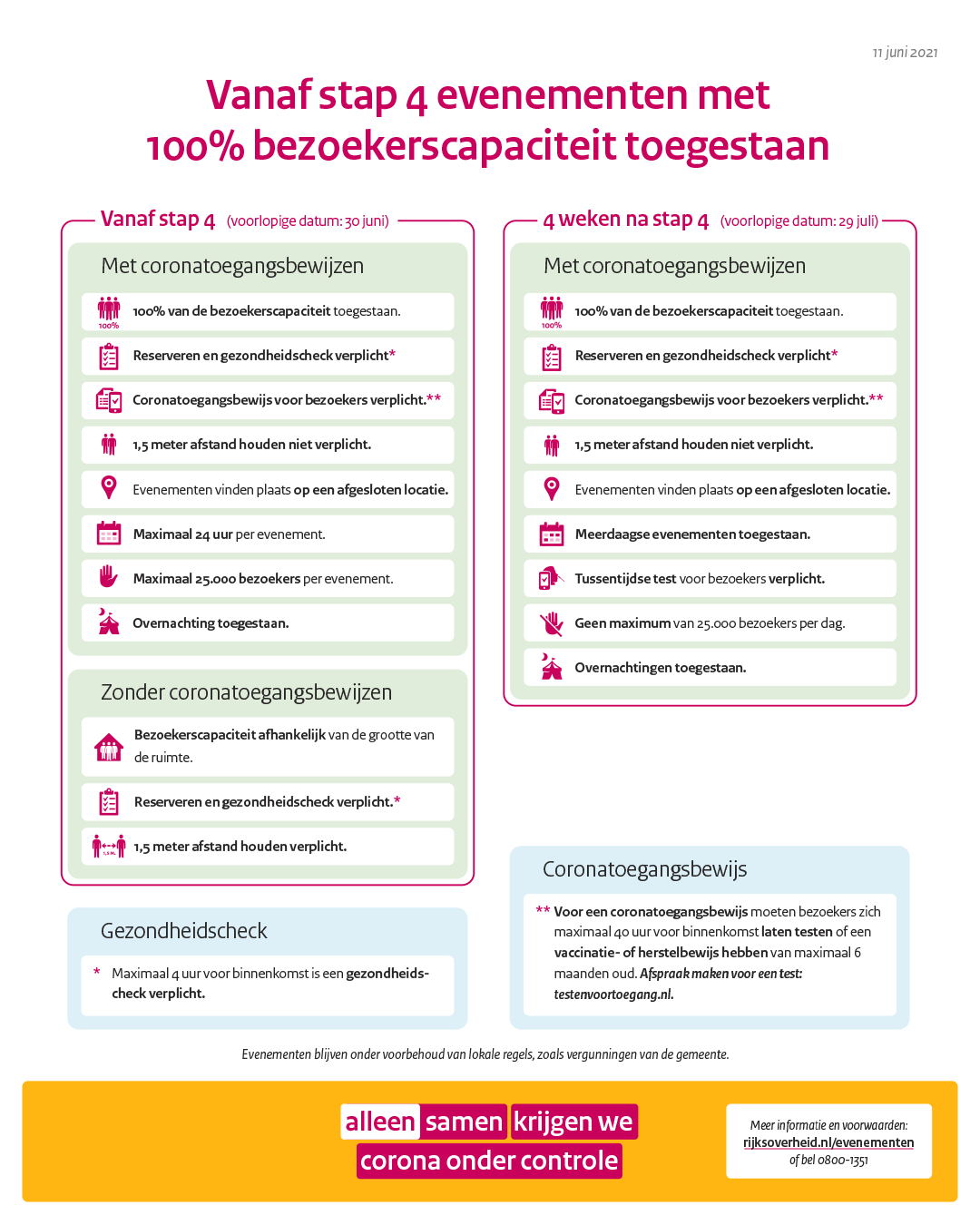 Vanaf 30 juni kunnen evenementen onder voorwaarden, zoals het gebruik van toegangstesten of een herstel- of vaccinatiebewijs, met 100% van de bezoekerscapaciteit georganiseerd worden. Ook de 1,5 meter afstand kan dan worden losgelaten tijdens het evenement. Het kabinet heeft op basis van de onderzoeksresultaten van Fieldlab Evenementen besloten om de routekaart hiervoor aan te passen. Meerdaagse evenementen met overnachting(en) zijn vanaf eind juli ook weer mogelijk. Daarbij gelden extra voorwaarden zoals tussentijds testen. Het kabinet is voornemens om de verruiming naar 100% van de bezoekerscapaciteit en het loslaten van de 1,5 meter bij inzet van toegangsbewijzen vanaf stap 4 ook voor andere sectoren zoals de horeca, culturele instellingen en professionele sportwedstrijden te laten gelden.