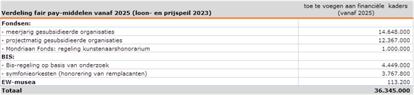 De Rijkscultuurfondsen, bis-instellingen en musea binnen de Erfgoedwet krijgen in totaal € 36,4 miljoen extra voor Fair Pay. Daartoe worden de subsidieplafonds van deze instellingen verhoogd. Staatssecretaris Uslu (Cultuur en Media) baseert zich hierbij op een onderzoek dat is uitgevoerd in opdracht van Kunsten ’92. De precieze verdeling staat in een brief die zij naar de Tweede Kamer heeft gestuurd. Eerder maakte de staatssecretaris al bekend dat er extra geld beschikbaar was om stappen te zetten richting eerlijke beloning van mensen werkzaam in de culturele sector.
