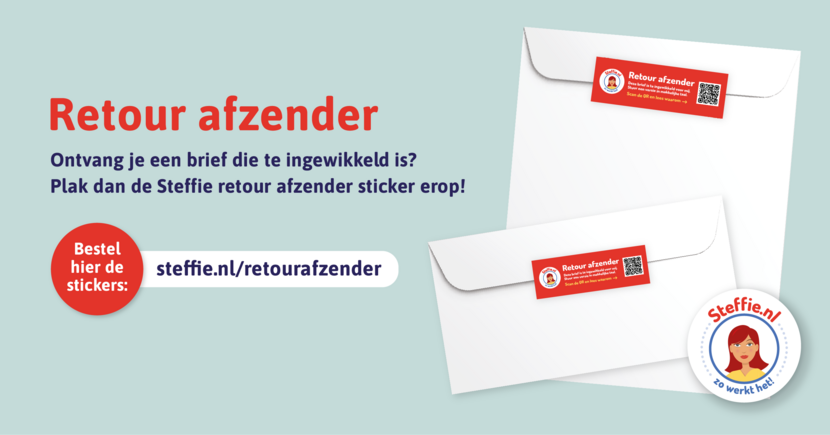 Steffie.nl heeft een sticker ontworpen die mensen op een envelop van een moeilijke brief kunnen plakken. ‘Retour afzender. Op de sticker staat: deze brief is te ingewikkeld voor mij, stuur een versie in makkelijkere taal.’ Via een QR-code kan de ontvanger lezen aan welke eisen de brief moet voldoen om wél begrijpelijk te zijn.