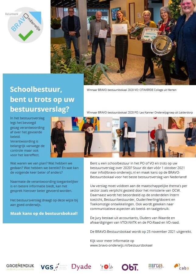 De branchevereniging voor onderwijsbedrijfsvoering reikt jaarlijks de BRAVO Bestuursbokaal uit aan het schoolbestuur met het beste bestuursverslag van Nederland.