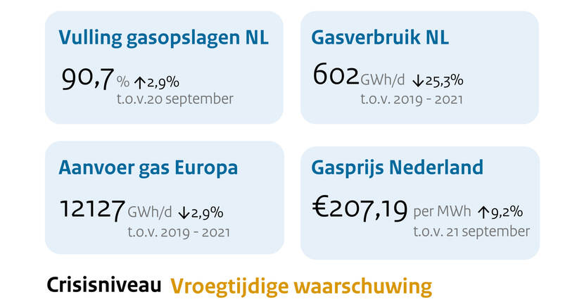 Crisisniveau Vroegtijdige waarschuwing: De overheid ontvangt dagelijks vanuit de gassector gedetailleerde informatie over gasleveringen.
