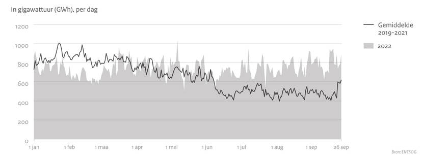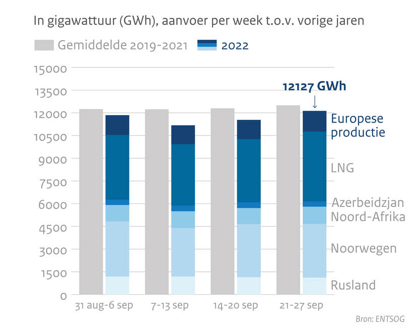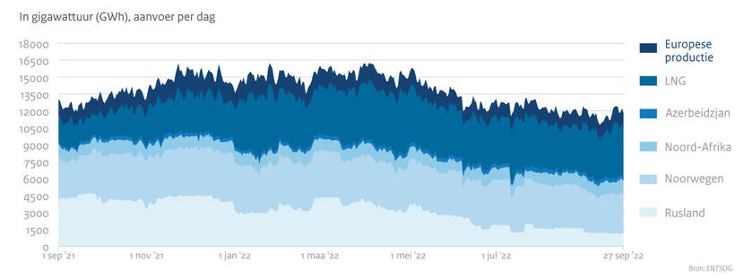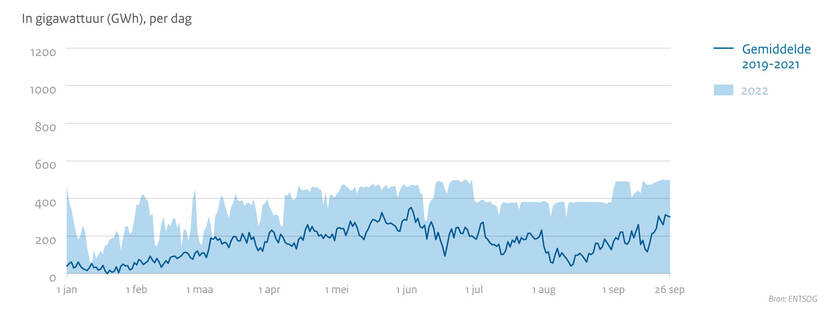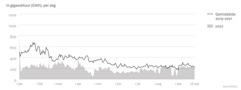 Gemiddelde aanvoer van gas voor Europa per dag in 2022