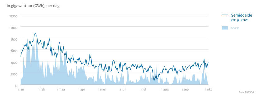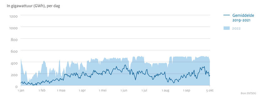 Gemiddelde aanvoer van gas voor Europa per dag in 2022