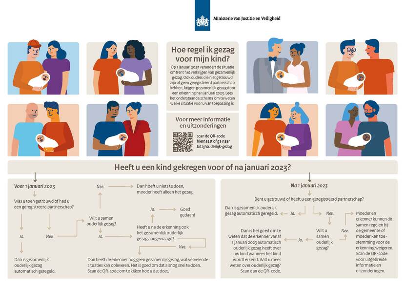 Op 1 januari 2023 verandert de situatie omtrent het verkrijgen van gezamenlijk gezag. Ook ouders die niet getrouwd zijn of geen geregistreerd partnerschap hebben, krijgen gezamenlijk gezag door een erkenning na 1 januari 2023. Lees het schema op de flyer om te weten welke situatie voor u van toepassing is.