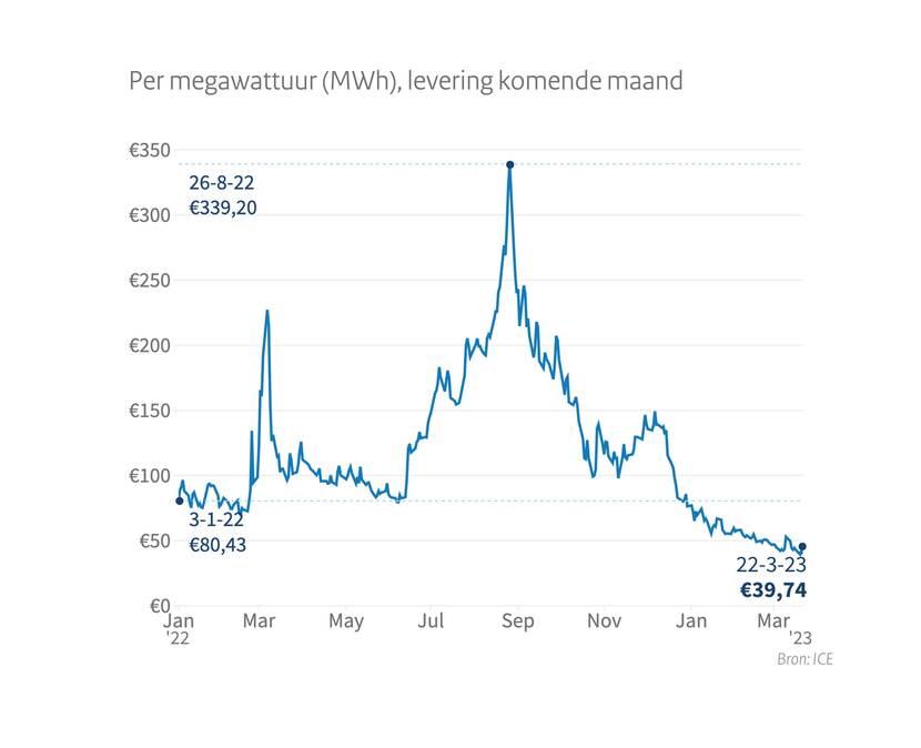 Gasprijs tussen 3 januari 2022 en 22 maart 2023 per megawattuur (MWh), levering komende maand