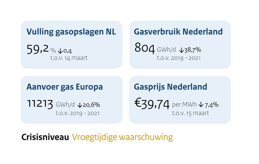 Crisisniveau Vroegtijdige waarschuwing: De overheid ontvangt vanuit de gassector dagelijks gedetailleerde informatie over gasleveringen.
