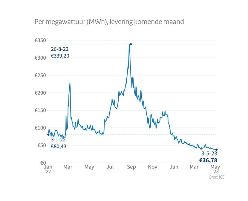Gasprijs tussen 3 januari 2022 en 3 mei 2023 per megawattuur (MWh), levering komende maand
