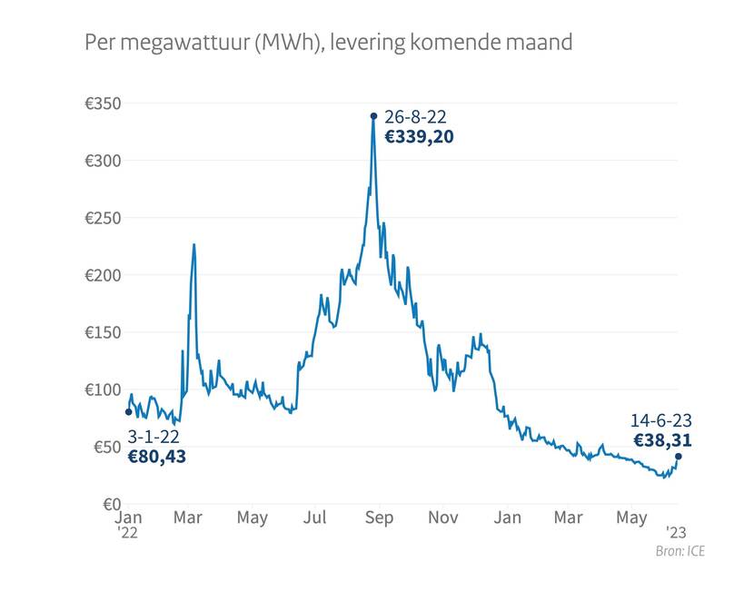 Gasprijs tussen 3 januari 2022 en 14 juni 2023 per megawattuur (MWh), levering komende maand