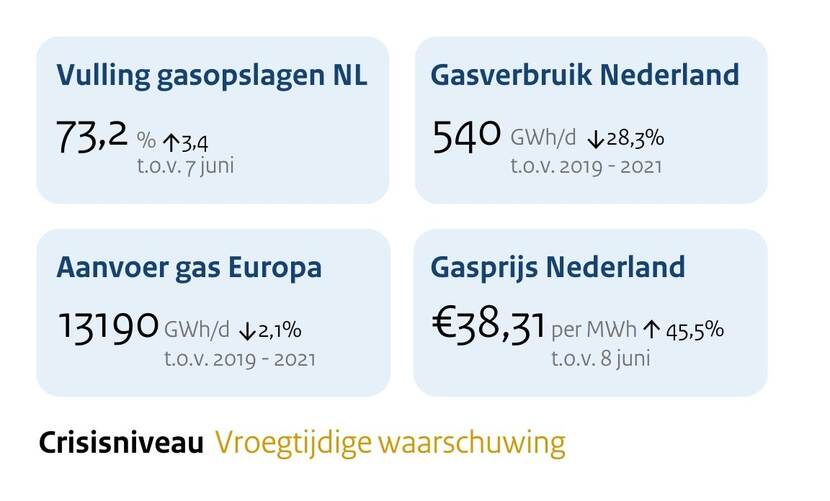 Crisisniveau Vroegtijdige waarschuwing: De overheid ontvangt vanuit de gassector dagelijks gedetailleerde informatie over gasleveringen.