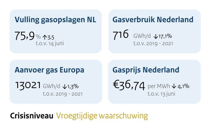 Crisisniveau Vroegtijdige waarschuwing: De overheid ontvangt vanuit de gassector dagelijks gedetailleerde informatie over gasleveringen.