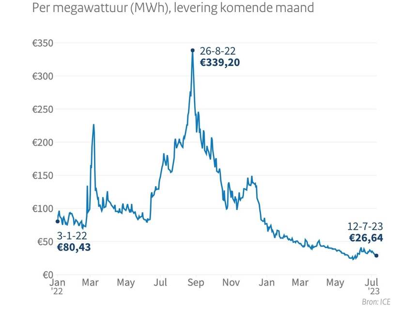 Gasprijs tussen 3 januari 2022 en 12 juli 2023 per megawattuur (MWh), levering komende maand.