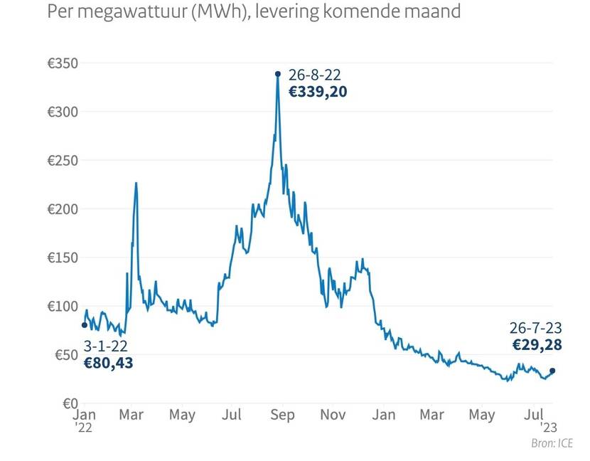 Gasprijs tussen 3 januari 2022 en 26 juli 2023 per megawattuur (MWh), levering komende maand.