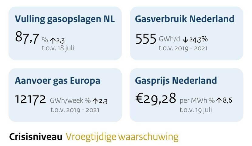 Crisisniveau Vroegtijdige waarschuwing: De overheid ontvangtvanuit de gassector dagelijks gedetailleerde informatie overgasleveringen.