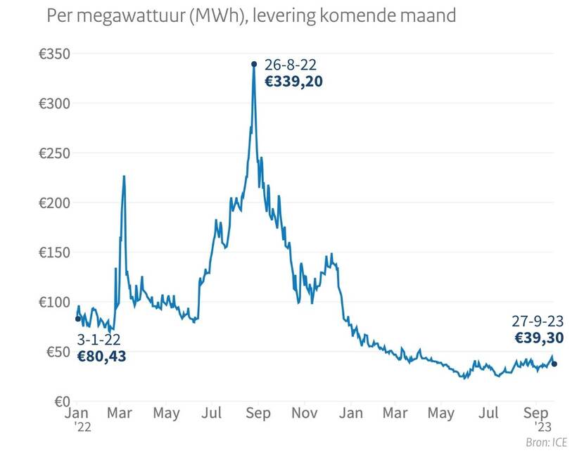 Gasprijs tussen 3 januari 2022 en 27 september 2023 per megawattuur (MWh), levering komende maand.