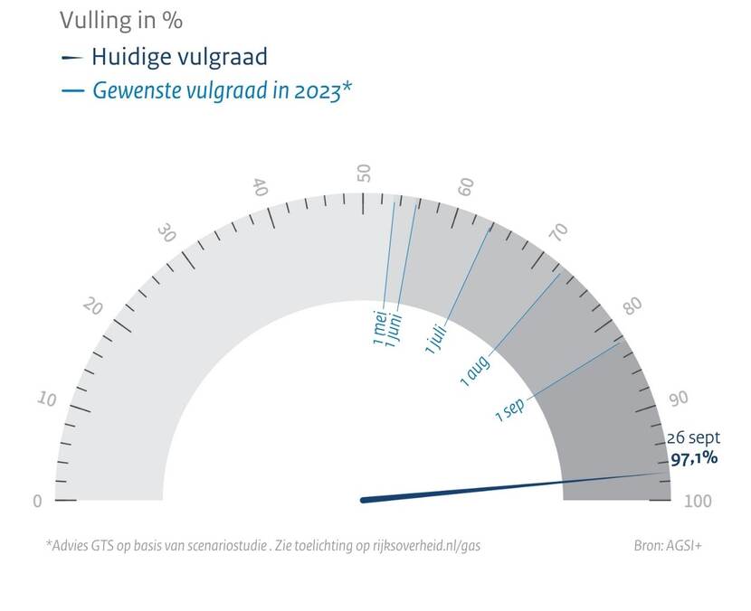 Het kabinet houdt de situatie op de gasmarkt nauwlettend in de gaten. U leest hier actuele cijfers over de zekerheid van de gaslevering. Dit is de update van 29 september 2023. Gedetailleerde gegevens over de Leveringszekerheid Gas zijn te vinden op de site van Gasunie Transport Services .