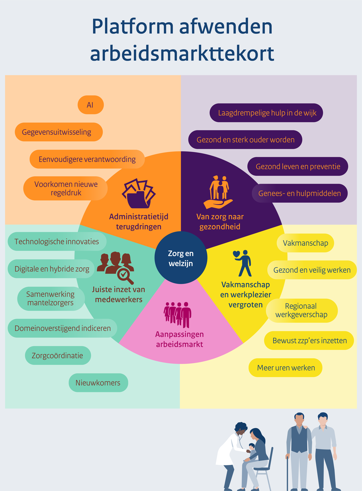 Om het personeelstekort in de zorg te verminderen, zijn aanpassingen nodig op de arbeidsmarkt. Zo moet het bijvoorbeeld meer lonen om te werken: dat is 1 van de doelen van de hervorming van het belasting- en toeslagenstelsel. En moet het voor mensen makkelijker worden om betaald werk te combineren met andere tijdsbesteding. Onder meer door het recht op flexibel werken onder de aandacht te brengen en het verlofstelsel eenvoudiger te maken. Maar ook goed werkgeverschap is hiervoor cruciaal. Daarnaast wordt er ingezet op de kwaliteit van werk. De overheid wil dit voor alle sectoren in Nederland regelen.