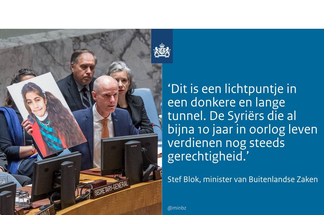 Minister Blok: ‘De getuigenverklaringen van de meest verschrikkelijke misdaden zijn inmiddels in ons collectieve geheugen gegrift. Zij geven ons de kans om een volgende stap te zetten op weg naar rechtvaardigheid en het Syrische regime aansprakelijk te stellen voor de misdaden die het heeft begaan.’