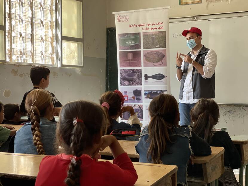 Eén op de drie bevolkte gebieden in Syrië is vermoedelijk vervuild met explosieven; een op de twee inwoners risico loopt door deze vervuiling, meldt het Humanitarian Needs Overview van 2021. Landmine Monitor registreerde in 2020 minstens 2.729 doden en gewonden door mijnen in dit land. Het is van levensbelang om je bewust te zijn van de gevaren, niet in de minste plaats voor mensen die in hun eigen land op de vlucht zijn geslagen. Medewerkers van The Danish Refugee Council geven daarom voorlichting over de risico’s van explosieven en mijnen.