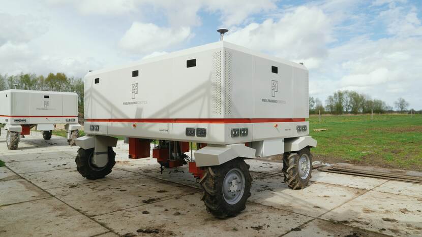 De landbouwrobot van Pixelfarming Robotics werkt op zonne-energie en kan door het gebruik van kunstmatige intelligentie (AI) onkruid tussen de gewassen verwijderen. Robot One is uitgerust met zestien camera’s en heeft tien armen die allemaal individueel kunnen bewegen en verschillende gereedschappen kunnen vasthouden. ‘De robot verzamelt data door het maken van beelden en beschikt over een laser om onkruid weg te branden. Onze robot kan uiteindelijk de werkzaamheden van vijf mensen overnemen.’
