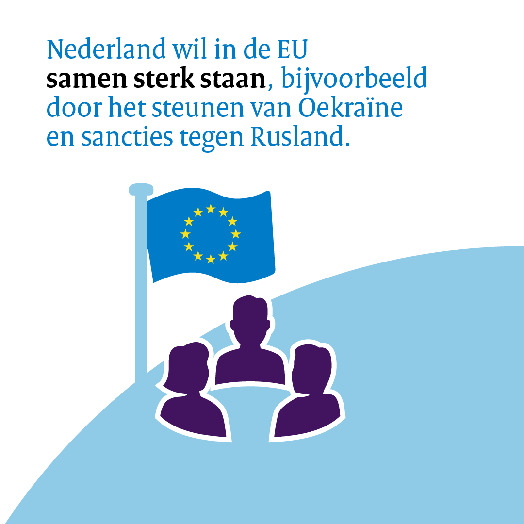 Samen staan we sterker. Dat bleek ook bij de gezamenlijke Europese reactie op de Russische invasie in Oekraïne. Nederland wil dat de EU die daadkracht vasthoudt. Alleen als we krachten bundelen met andere landen kunnen we goed inspelen op de ontwikkelingen in de wereld. Bijvoorbeeld als het gaat om onze veiligheid.