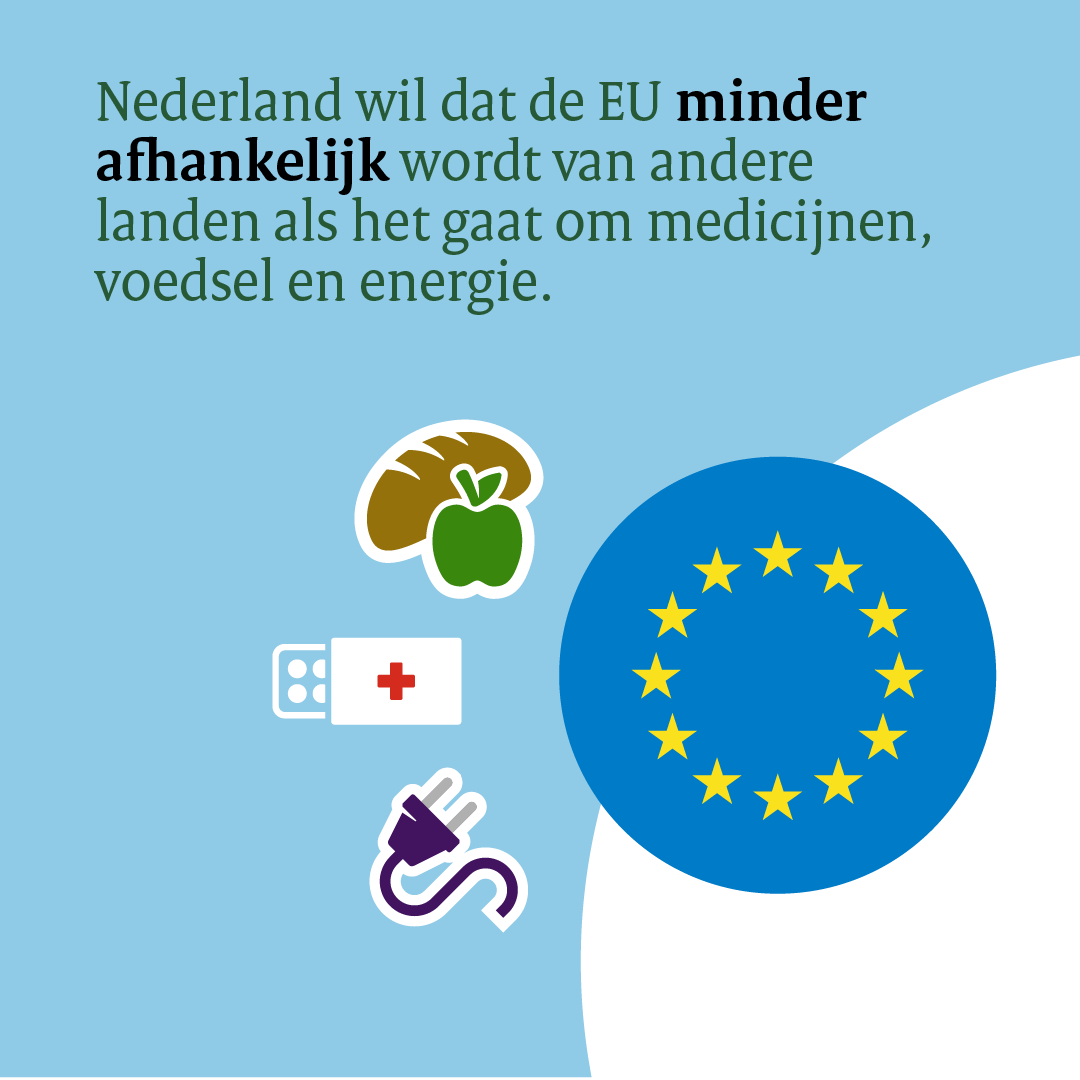 - minder afhankelijk zijn van andere landen. Bijvoorbeeld als het gaat om medicijnen, voedsel, grondstoffen en energie moet de EU meer op eigen benen staan.