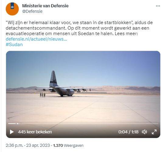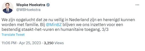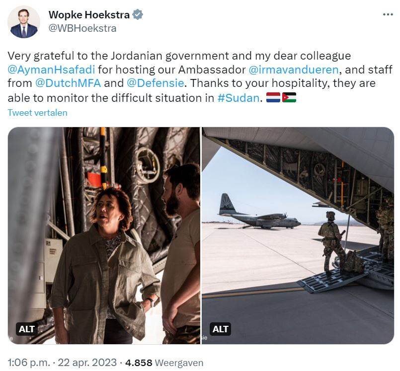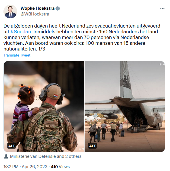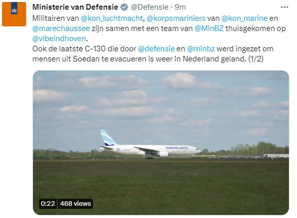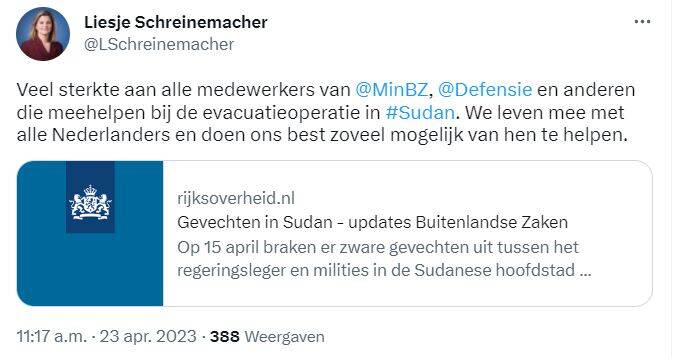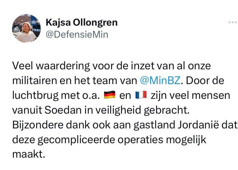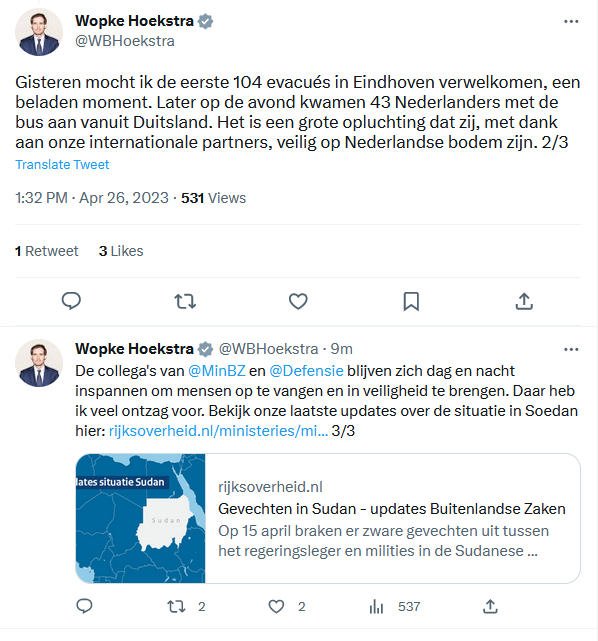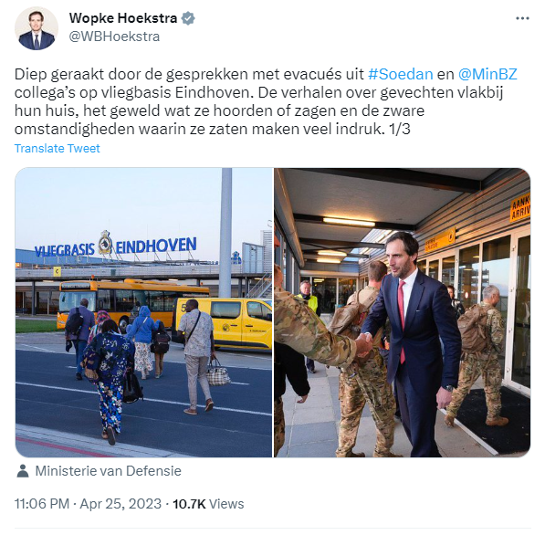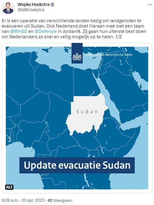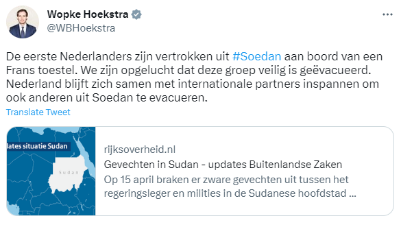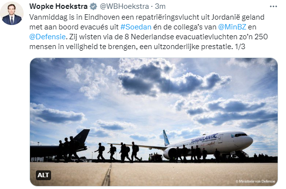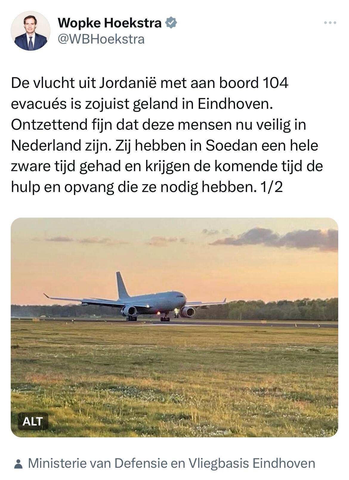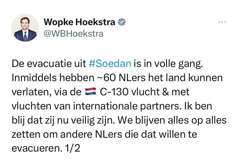 Minister Hoekstra op Twitter: 'De afgelopen dagen heeft Nederland zes evacuatievluchten uitgevoerd uit Soedan. Inmiddels hebben ten minste 150 Nederlanders het land kunnen verlaten, waarvan meer dan 70 personen via Nederlandse vluchten. Aan boord waren ook circa 100 mensen van 18 andere nationaliteiten. Gisteren mocht ik de eerste 104 evacués in Eindhoven verwelkomen, een beladen moment. Later op de avond kwamen 43 Nederlanders met de bus aan vanuit Duitsland. Het is een grote opluchting dat zij, met dank aan onze internationale partners, veilig op Nederlandse bodem zijn. De collega's van Buitenlandse Zaken en Defensie blijven zich dag en nacht inspannen om mensen op te vangen en in veiligheid te brengen. Daar heb ik veel ontzag voor.'