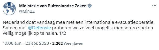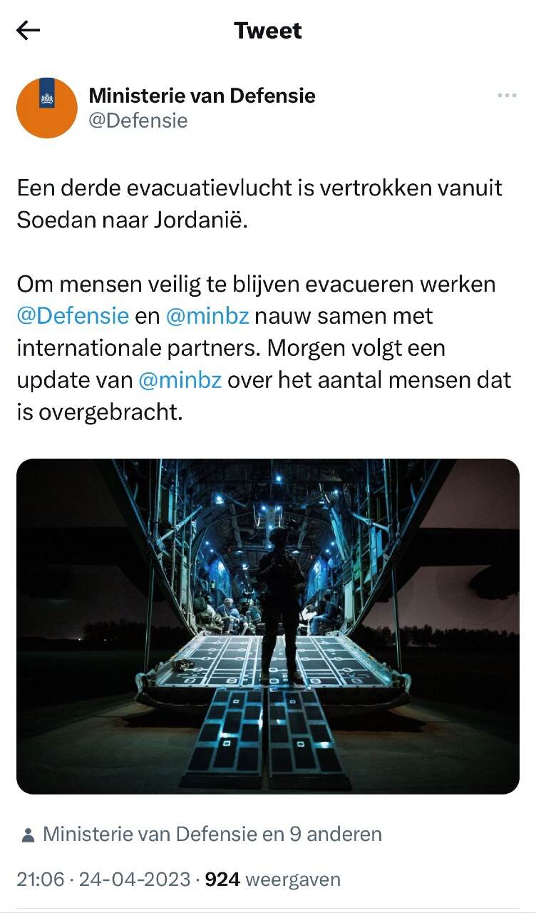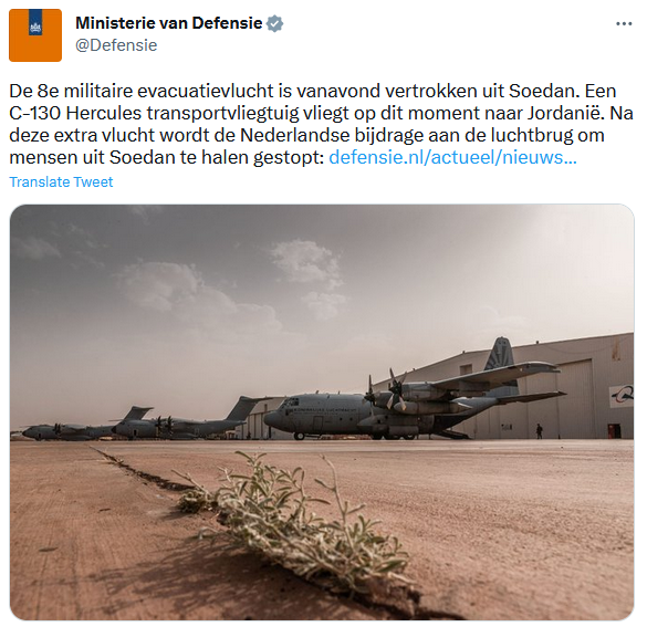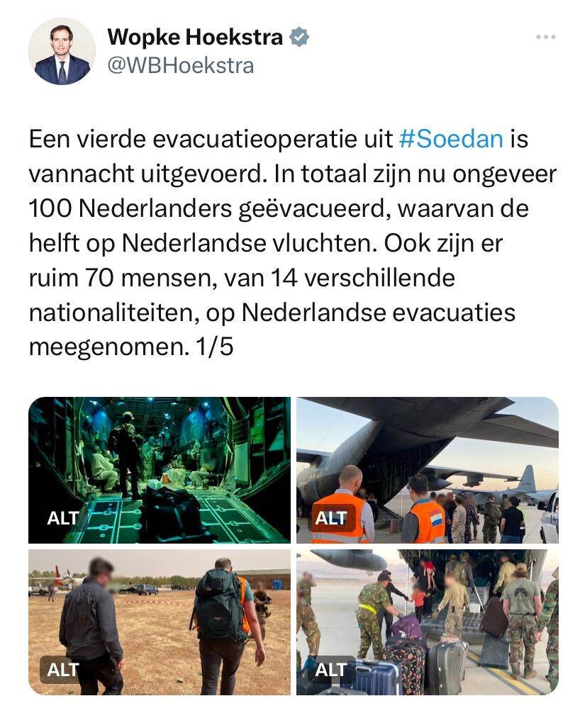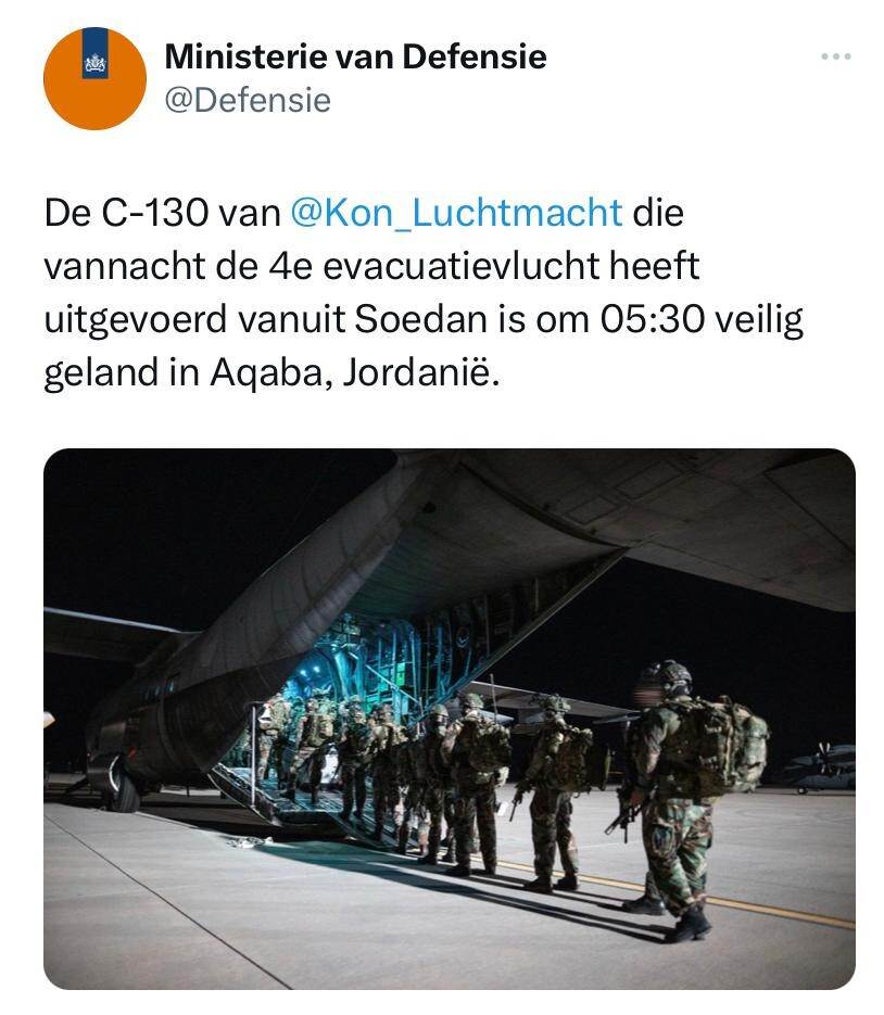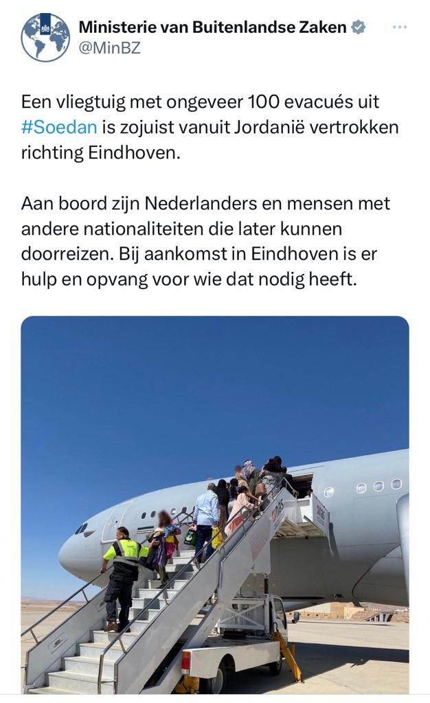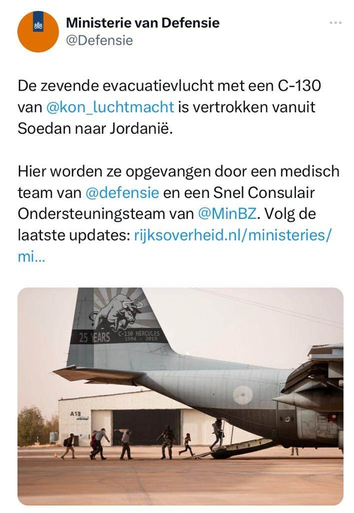Inmiddels heeft Nederland zeven evacuatievluchten uitgevoerd uit Soedan. In totaal zijn er ten minste 160 Nederlanders geëvacueerd, waarvan meer dan 85 door de Koninklijke Luchtmacht. Op deze Nederlandse vluchten zijn ook circa 130 evacués meegenomen van 18 andere nationaliteiten. De evacuatievluchten van verschillende internationale partners gaan nog door. We leven intens mee met iedereen die zich nog in Soedan bevindt. Zie ook het bericht van Buitenlandse Zaken op Twitter.