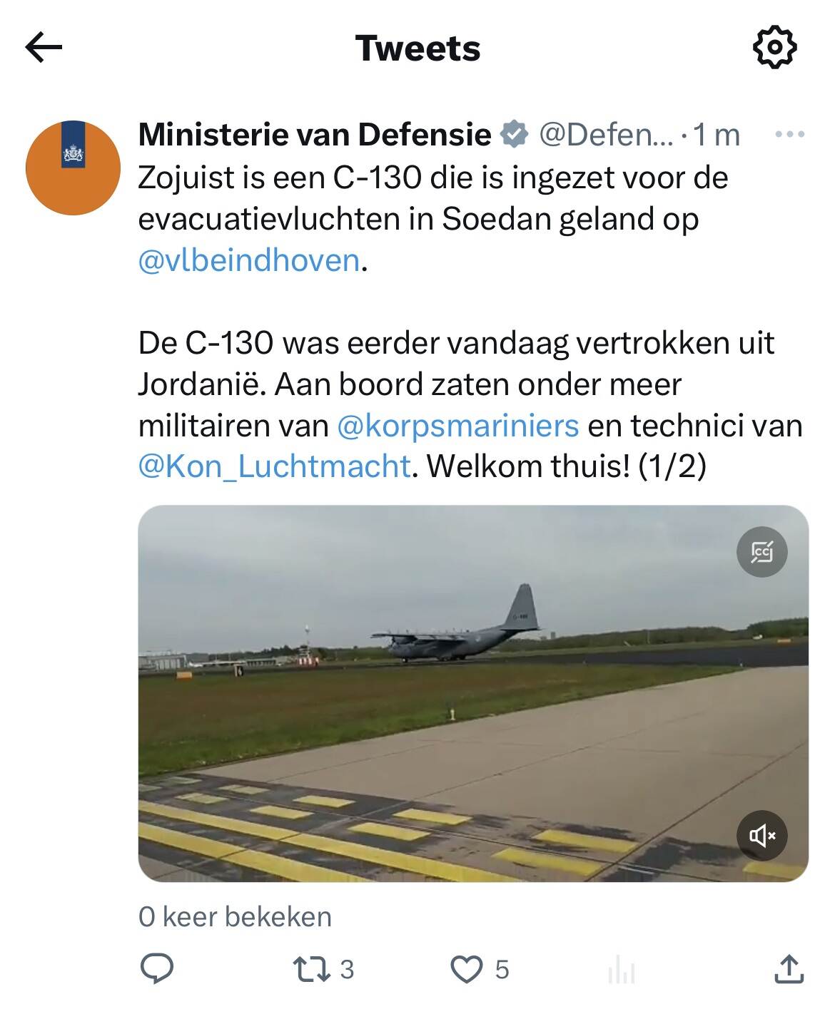 Het ministerie van Defensie meldt donderdagavond dat de C-130, het vliegtuig waarmee evacuatievluchten uit Soedan zijn uitgevoerd, is teruggekeerd naar Nederland. Aan boord zaten militairen van het Korps Mariniers en personeel van de Luchtmacht.