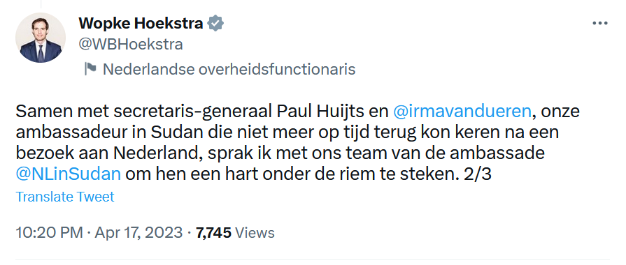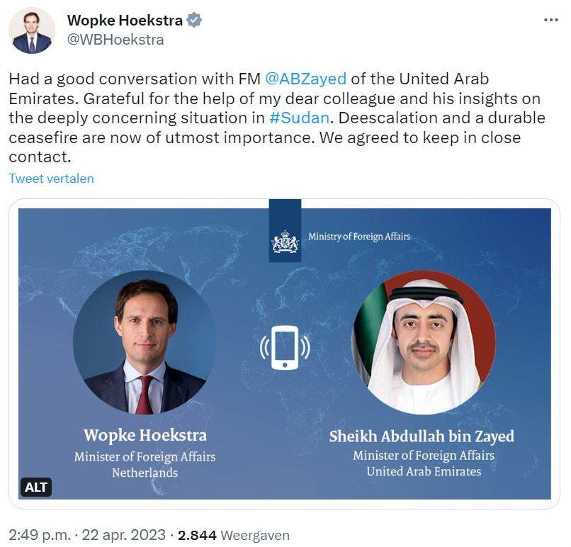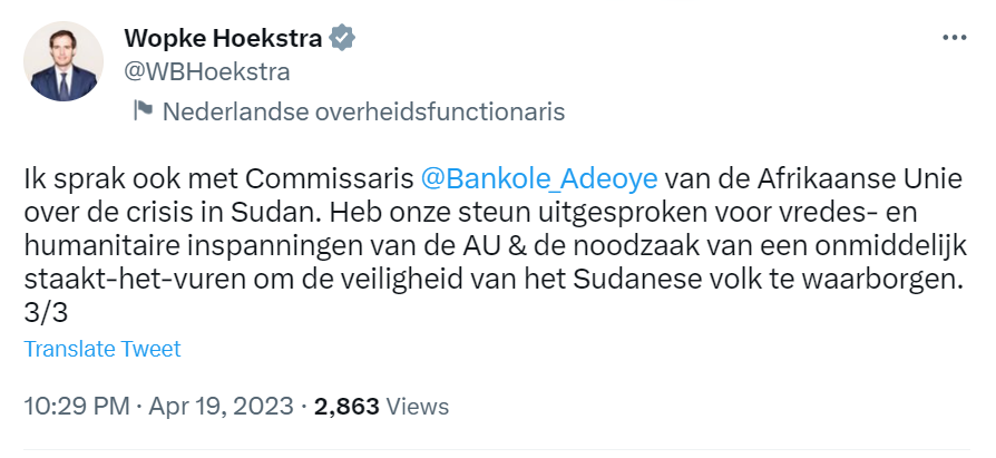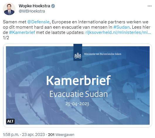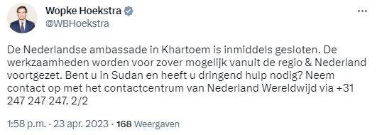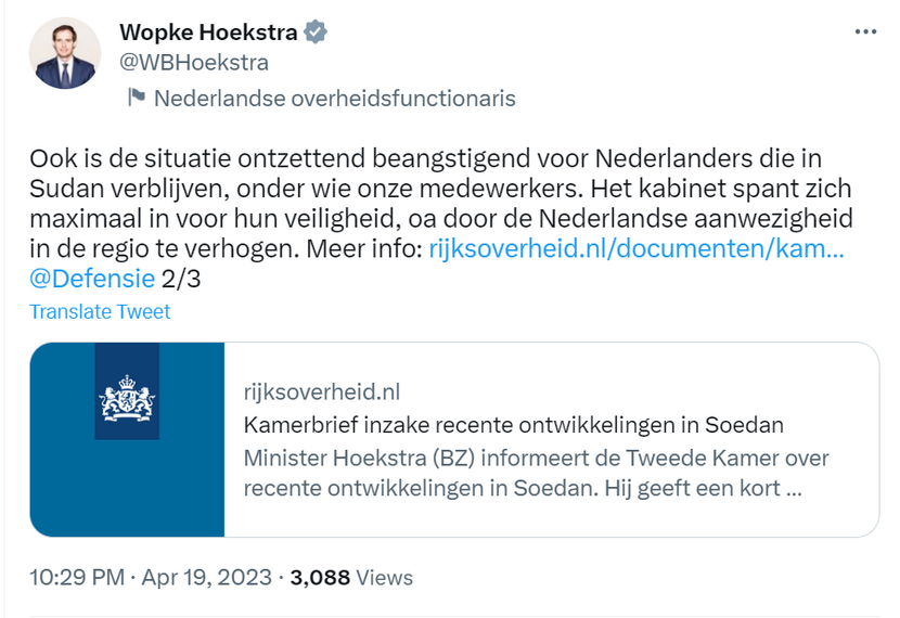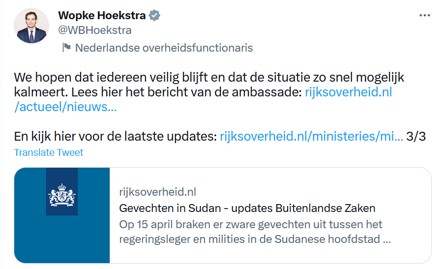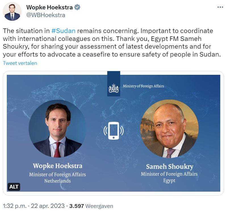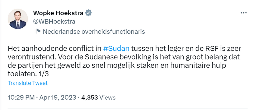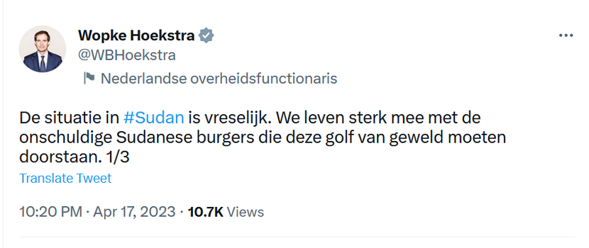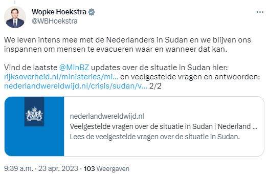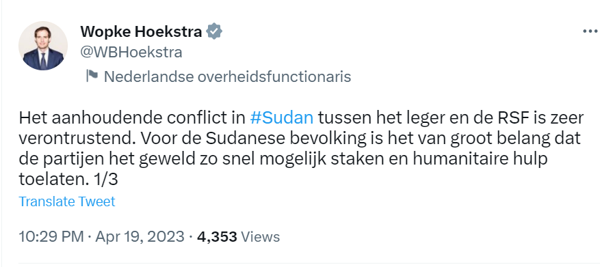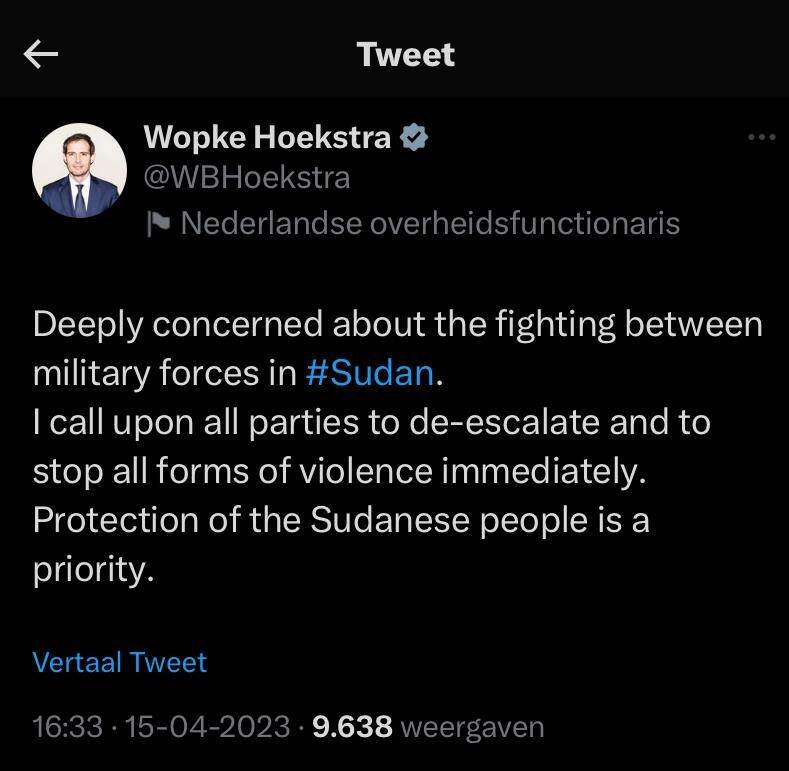 Minister van Buitenlandse Zaken Wopke Hoekstra reageert op de situatie in Sudan via Twitter.