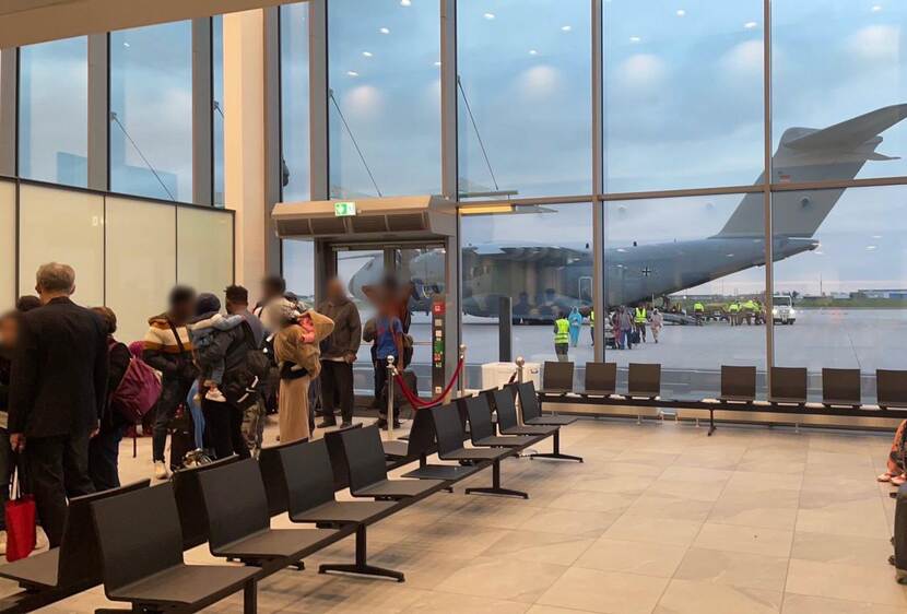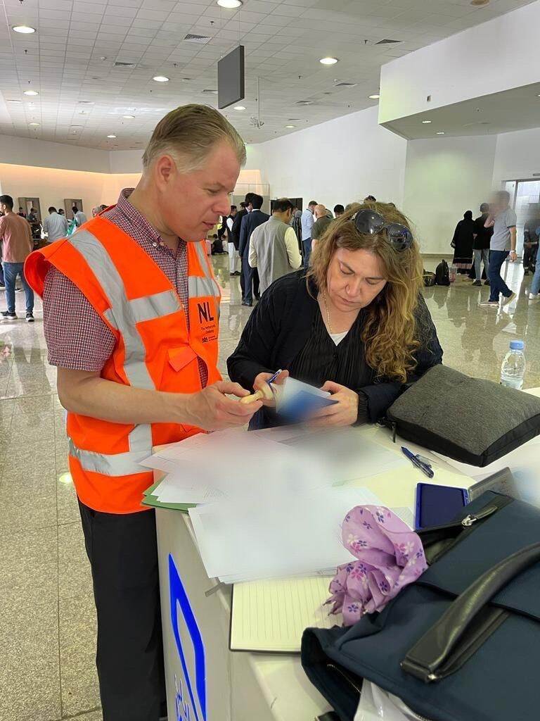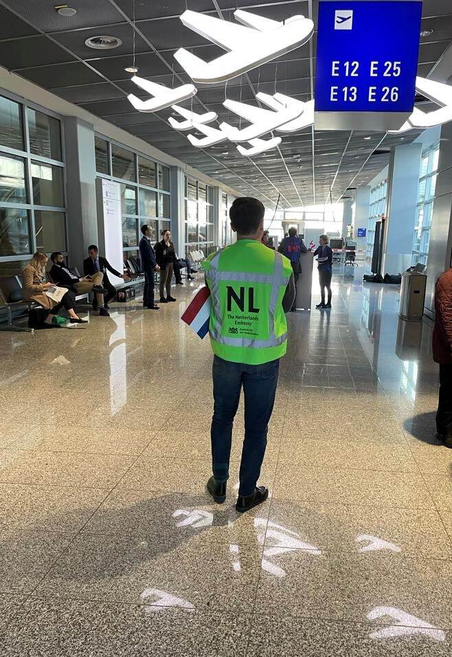Ambassadepersoneel wachtte op de luchthaven in Berlijn om Nederlanders op te vangen die met een Duitse evacuatievlucht aankwamen.
