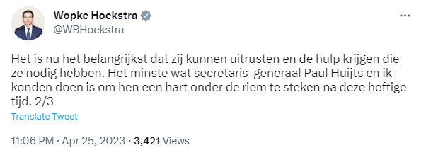 Dat schrijft minister van Buitenlandse Zaken Wopke Hoekstra op Twitter. Bekijk het volledige bericht op Twitter