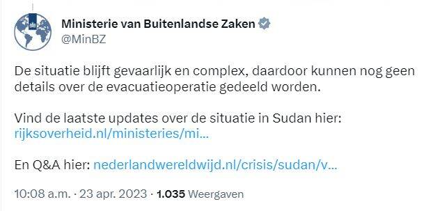 Vandaag organiseerde het ministerie van Buitenlandse Zaken een online bijeenkomst voor Nederlanders die in het land zijn. Zij konden vragen stellen, en verantwoordelijke medewerkers van het ministerie lichtten de laatste ontwikkelingen in Sudan en actieve inzet van het ministerie toe. In eerste instantie zou ambassadeur Irma van Dueren de bijeenkomst leiden, maar zij was op een andere locatie druk bezig met de crisis. Haar plaatsvervanger, Martijn Lambarts nam wel deel.