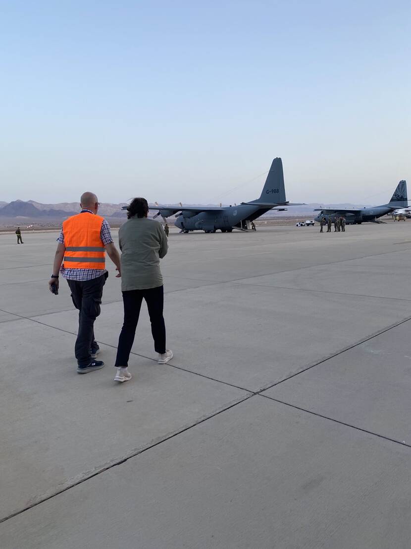 Ambassadeur Irma van Dueren en een SCOT’er op het vliegveld in Aqaba op weg naar een transportvliegtuig van Defensie om evacués op te halen.
