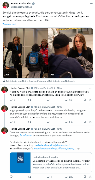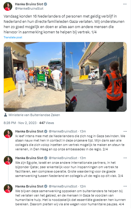 Ze geeft verder aan dat de uit Gaza vertrokken personen in Caïro zullen worden opgevangen door de Nederlandse ambassade. Nederland blijft zich inspannen om de andere Nederlanders die nog in Gaza vastzitten zo snel mogelijk in veiligheid te brengen, zo besluit Bruins Slot.