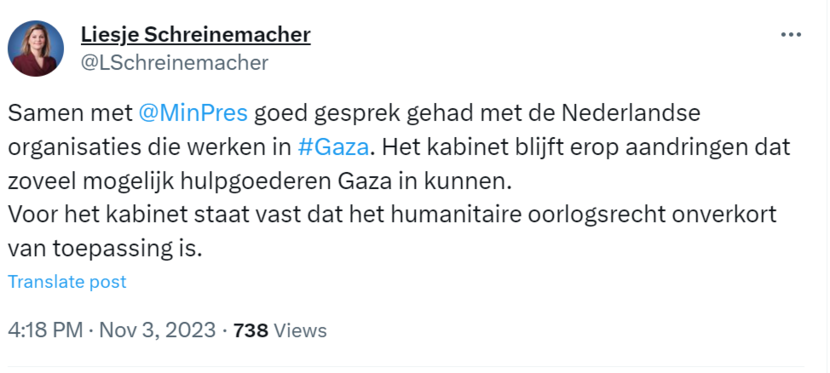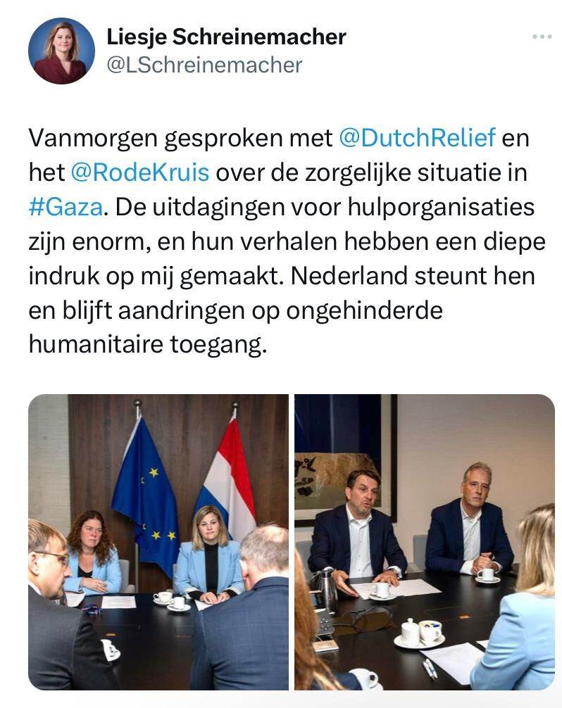 Minister Liesje Schreinemacher (Ontwikkelingssamenwerking) sprak vandaag met hulporganisaties over de situatie in de Gaza-strook. 'Hun verhalen hebben diepe indruk op mij gemaakt', schrijft de minister op X. Nederland blijft aandringen dat hulpgoederen worden toegelaten in het gebied.