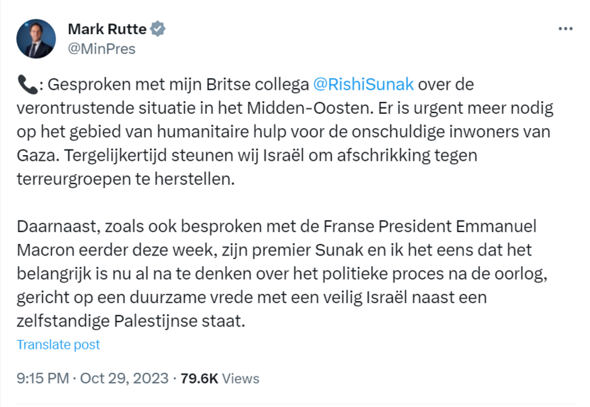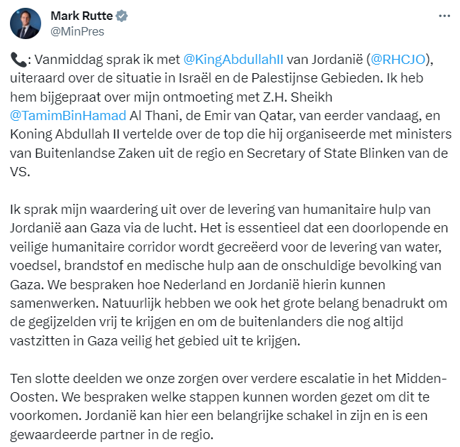 Minister-president Mark Rutte meldt op X: 'Gesproken met mijn Britse collega Rishi Sunak over de verontrustende situatie in het Midden-Oosten. Er is urgent meer nodig op het gebied van humanitaire hulp voor de onschuldige inwoners van Gaza. Tergelijkertijd steunen wij Israël om afschrikking tegen terreurgroepen te herstellen.
