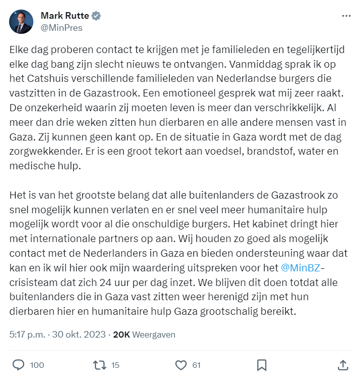 Minister-president Rutte spreekt familieleden van Nederlandse burgers die vastzitten in de Gazastrook