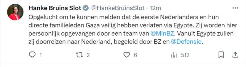Minister Hanke Bruins Slot van Buitenlandse Zaken is dankbaar dat zes personen met de Nederlandse nationaliteit of verblijfsstatus vanuit Gaza via Rafah aangekomen in Egypte. Dat laat zij weten op X.