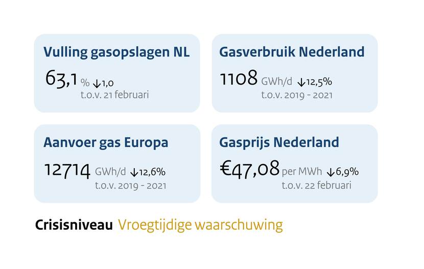 Crisisniveau Vroegtijdige waarschuwing: De overheid ontvangt vanuit de gassector dagelijks gedetailleerde informatie over gasleveringen.