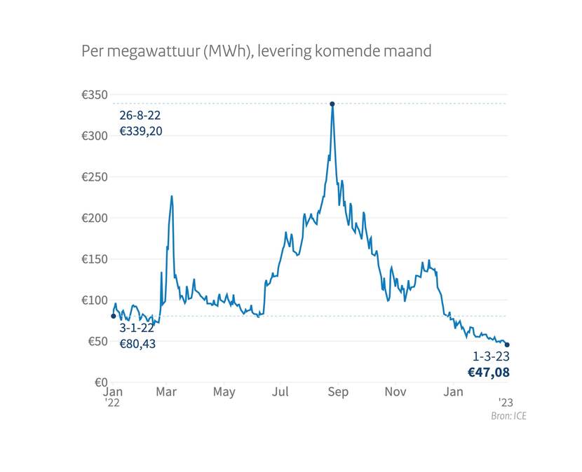 Gasprijs tussen 3 januari 2022 en 1 maart 2023 per megawattuur (MWh), levering komende maand
