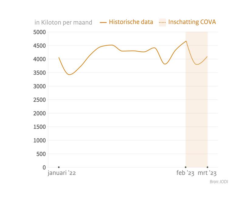 Raffinage ruwe olie Nederland tussen januari 2022 en maart 2023 in Kiloton per maand.