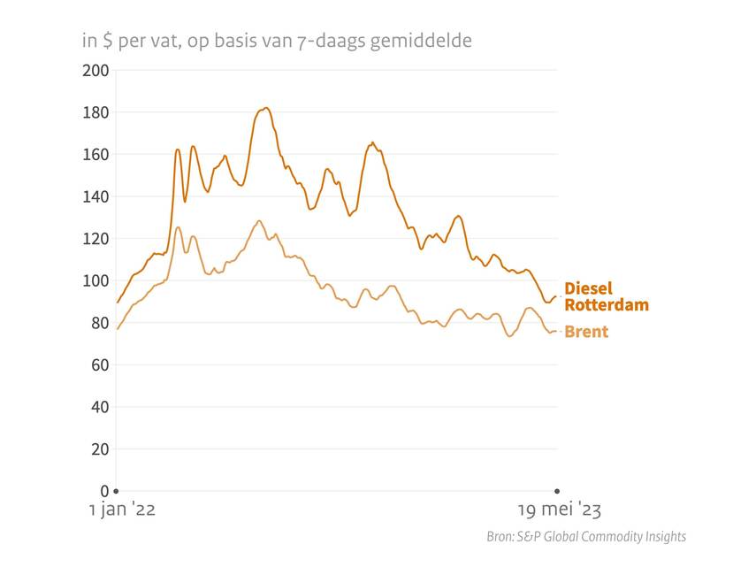 Ontwikkeling olieprijs tussen 1 januari 2022 en 19 mei 2023