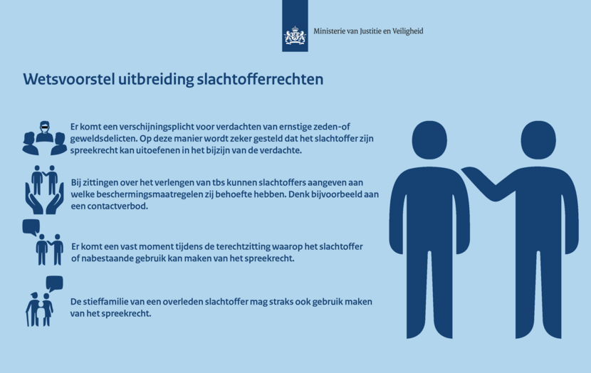 Verder komt er een vast moment waarop van het algemene spreekrecht gebruik kan worden gemaakt. Nu wordt daar verschillend mee omgegaan. De bewindsman stelt voor het slachtoffer of de nabestaande te laten spreken voorafgaand aan het requisitoir van de officier van justitie. Dan kan de officier er nog rekening mee houden. Tot slot wordt de voorschotregeling aan slachtoffers en nabestaanden uitgebreid naar overtredingen. De regeling beperkt zich nu tot zaken waarin sprake is geweest van een misdrijf.