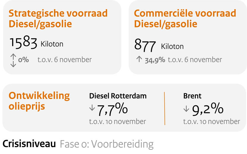 Het kabinet houdt de situatie op de oliemarkt goed in de gaten. U leest hier cijfers over onder andere dieselvoorraden. Dit is de update van 15 december.
