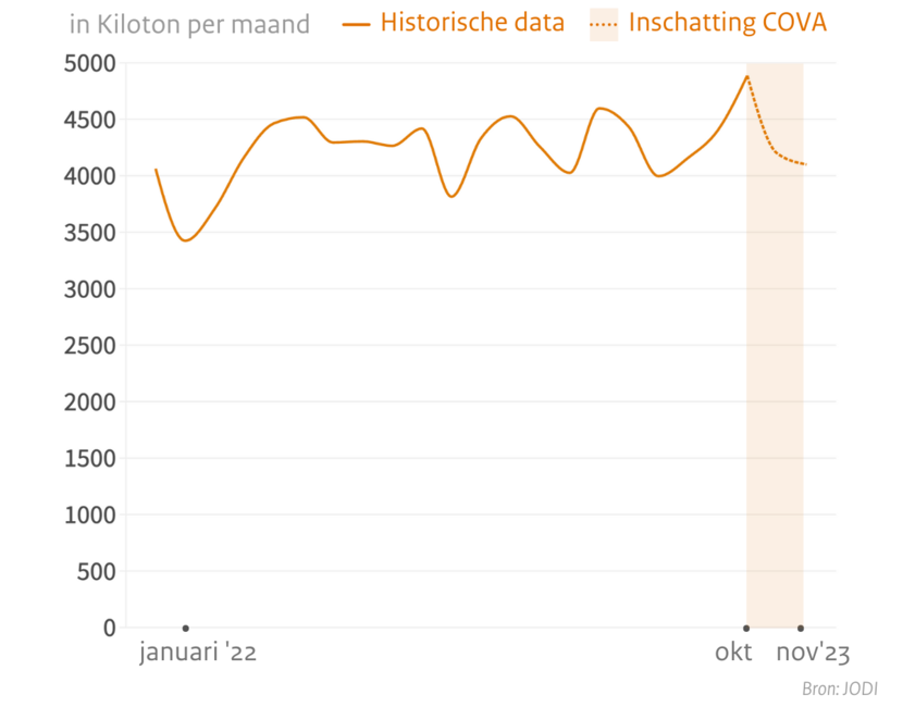 Raffinage ruwe olie Nederland tussen januari 2022 en november 2023 in Kiloton per maand.