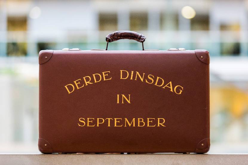 Minister Lieftinck kocht bij leerhandel Van de Broek in Den Haag een eenvoudig bruin koffertje. Hier liet hij in goudkleurige letters de tekst ‘derde dinsdag in september' op aanbrengen. Al snel zijn de papieren letters vervangen door goudverf.
