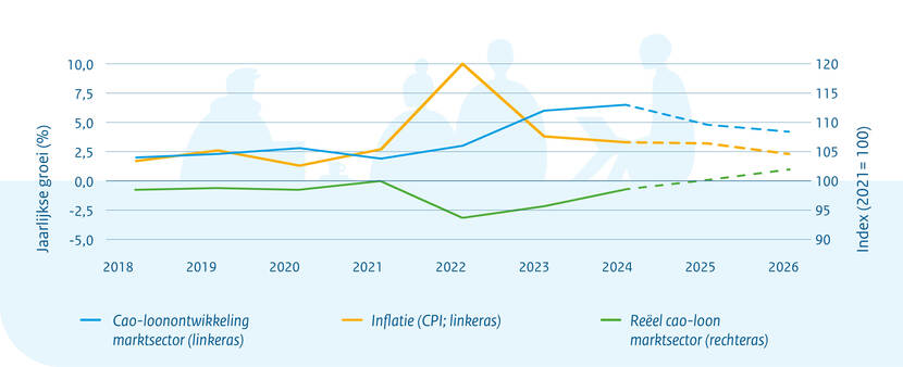 De lonen groeien naar verwachting ook in 2025 en 2026 harder dan de inflatie. Hierdoor liggen de reële lonen weer op het niveau van voor de energiecrisis.
