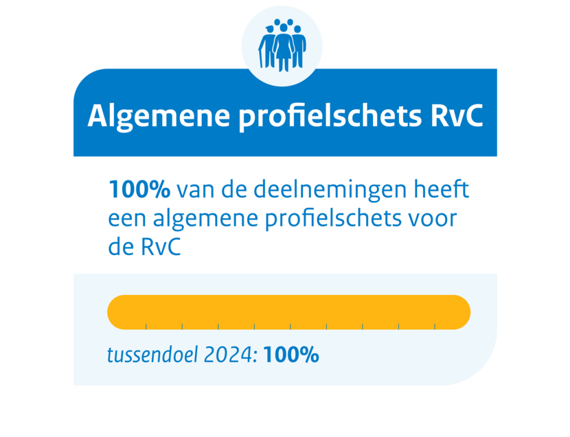 Het eerdere tussendoel voor 2024 dat 100% van de raden van bestuur een algemene profielschets heeft, is vervallen. Want het ministerie van Financiën werkt op dit moment aan uitgangspunten voor deze profielschetsen. En wil hierop wachten, voordat een nieuwe algemene profielschets wordt opgesteld voor de raad van bestuur. Het doel is dat eind 2025 alle deelnemingen een algemene profielschets hebben die aan de uitgangspunten voldoet.